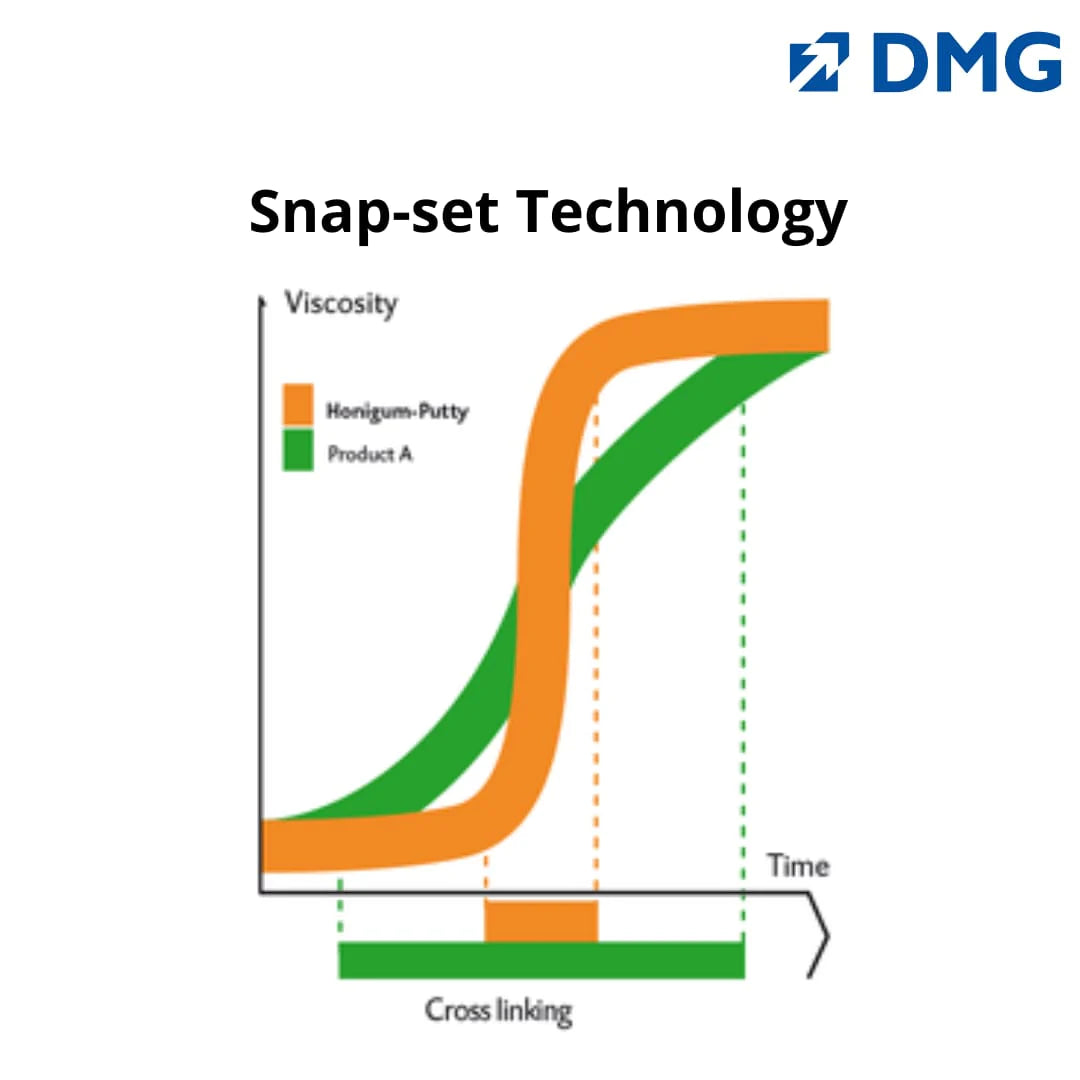 Thanks to the DMG-developed Snap-Set technology the new Honigum-Putty offers a so far unrivaled combination of comfortable working time and short time in mouth. Its generous working time reduces the »mix stress« to a minimum.