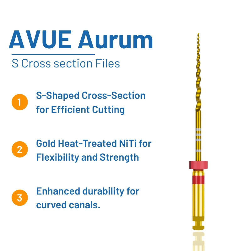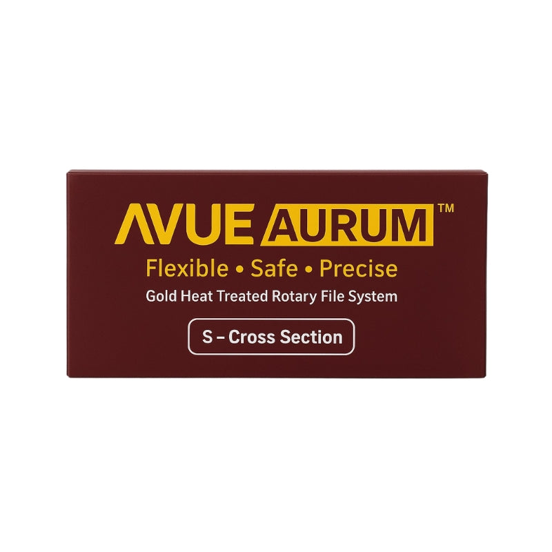 Our next-generation Aurum S Cross section rotary files unite advanced geometry with modern metallurgy. The S-shaped cross-section reduces core mass while dual blades deliver efficient cutting and debris removal. Made from heat-treated NiTi and enhanced with plasma electroplating, the files offer superior durability, reduced friction, and reliable performance for safe, predictable preparation in curved or narrow canals