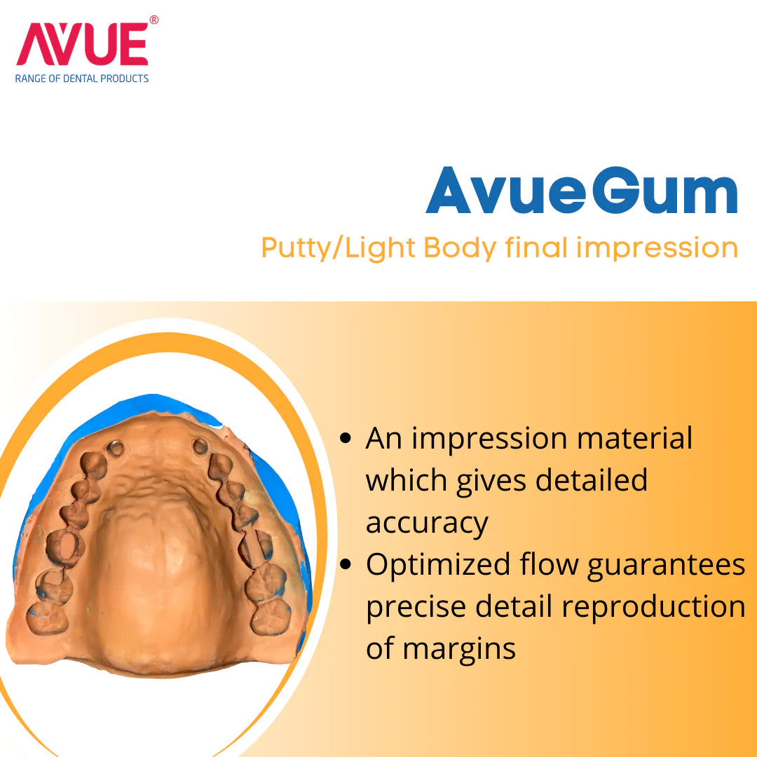 A. Avue gum light body is thixotropic, has high tear resistance, and can be poured long after taking impressions without loss of accuracy, homogeneous mix and bubble-free consistency.