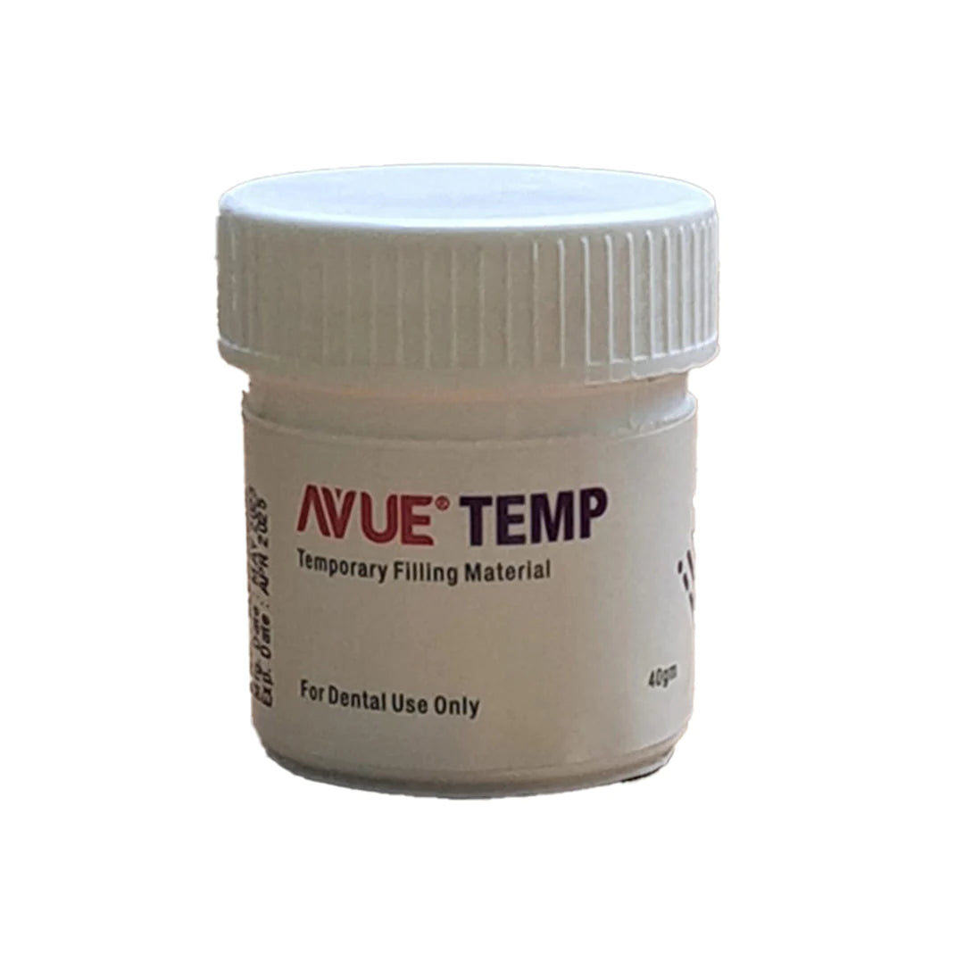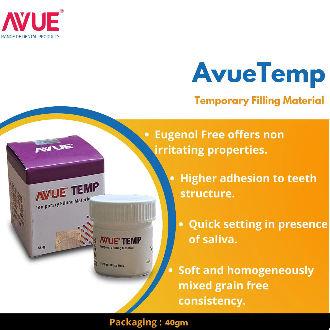 AvueTemp is a paste consistency, radio-opaque temporary filling material. It is moisture activated, set within 20-30 minutes upon contact with oral fluids. It possess high adhesive and sealing properties to ensure three dimensional hermetic seal.