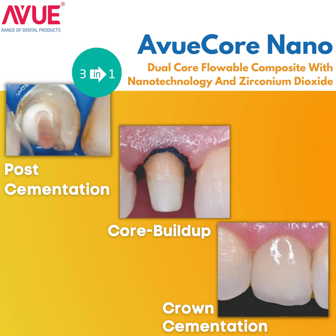 AvueCore Nano is a dual cure high radiopaque flowable composite material with nano particles for core-build-up and cementation of posts.it Improves the composite’s physical properties and flow characteristics making AvueCore Nano more strong and durable.