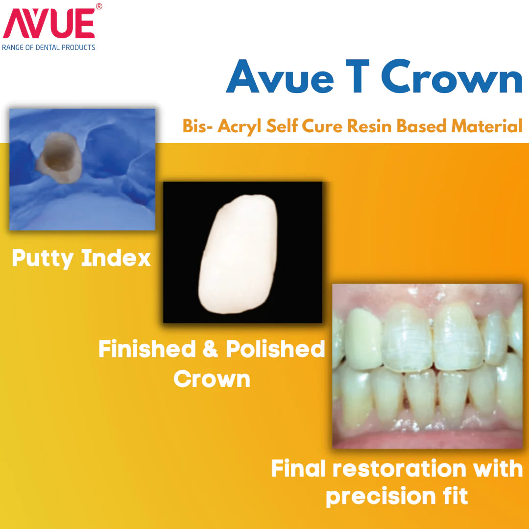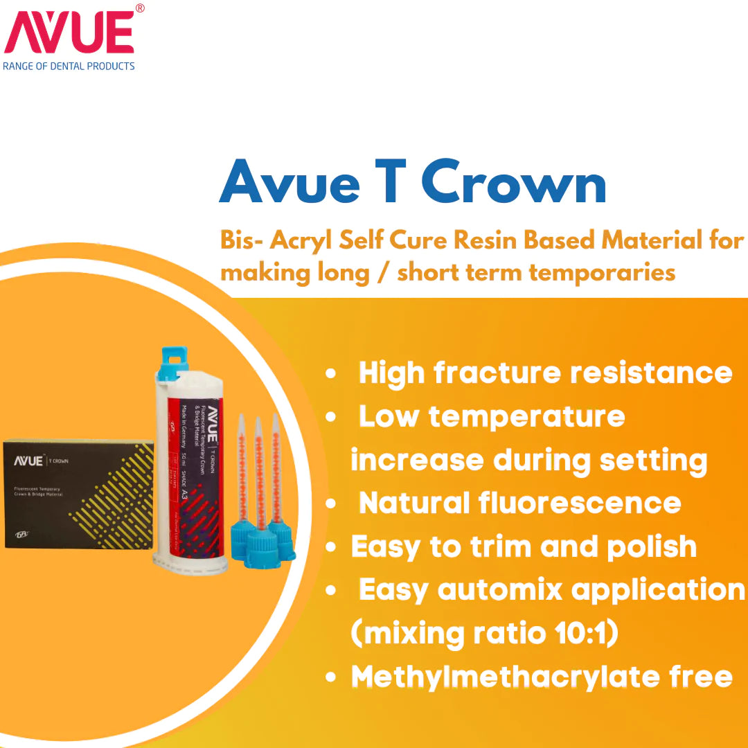 AvueT Crown is a self-curing composite for natural looking long and short term temporization. It is automatically mixed and available in the mixing ratio of 10:1.AvueT Crown is dispensed from preloaded syringes or cartridges and mixed through an automix tip. This provides consistent mixtures with no air incorporation into the final mix.