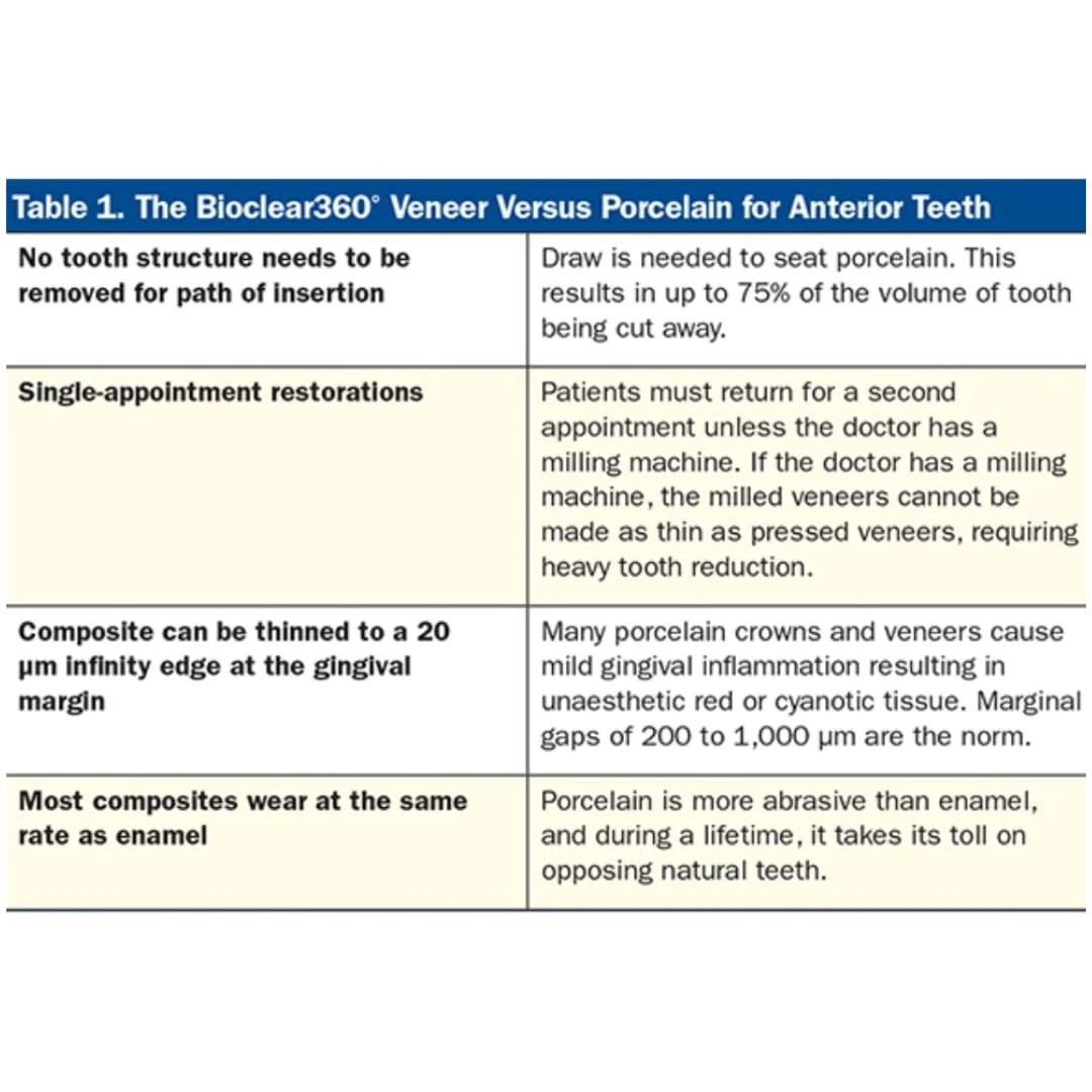 The Bioclear 360° Veneer comes as a 6 tooth kit with 12 matrices that are specially designed to create a 2 part form around the tooth by using both mesial and distal abutting matrices.