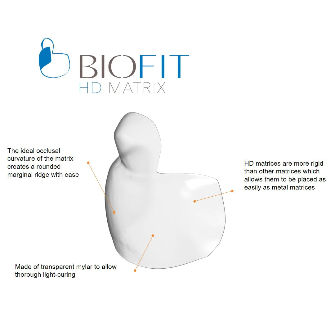 The HD series Bioclear Biofit matrices introduce new matrix technology and designs that ensure ideal tooth contours. Formed with translucent white 75µ mylar, the stiffer mylar and placement tab provides a rigid structure that makes the matrix easy to place.