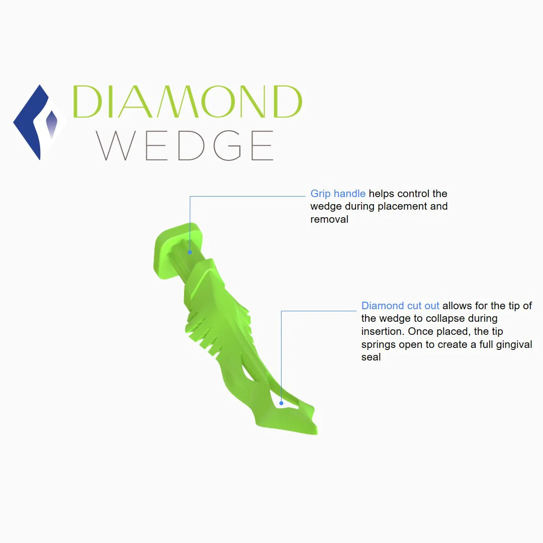 The Diamond Wedge requires less effort to place than traditional wedges due to the diamond-shaped cut-out in the tip, which collapses during insertion. The wedge then springs open once through the embrasure, creating a tight seal and preventing the wedge from backing out.