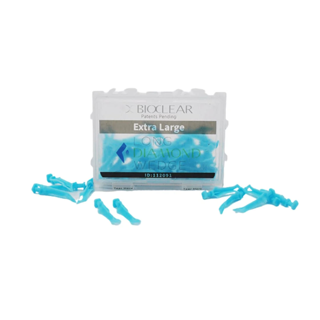 The Bioclear Diamond Wedge is designed to solve many of the difficulties in using traditional wedges. The Diamond Wedge requires less effort to place than traditional wedges due to the diamond shaped cut-out in the tip, which collapses during insertion. The wedge then springs open once through the embrasure, creating a tight seal and preventing the wedge from backing out.