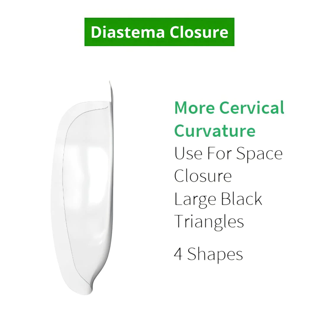 The Diastema Closure matrices are for creating new and exaggerated emergence profiles, closing diastema larger than 1mm and for large black triangles. The Diastema Closure matrices have more curvature than the Anterior matrices. Combining papilla regeneration with space closure is the key to optimal diastema closure.