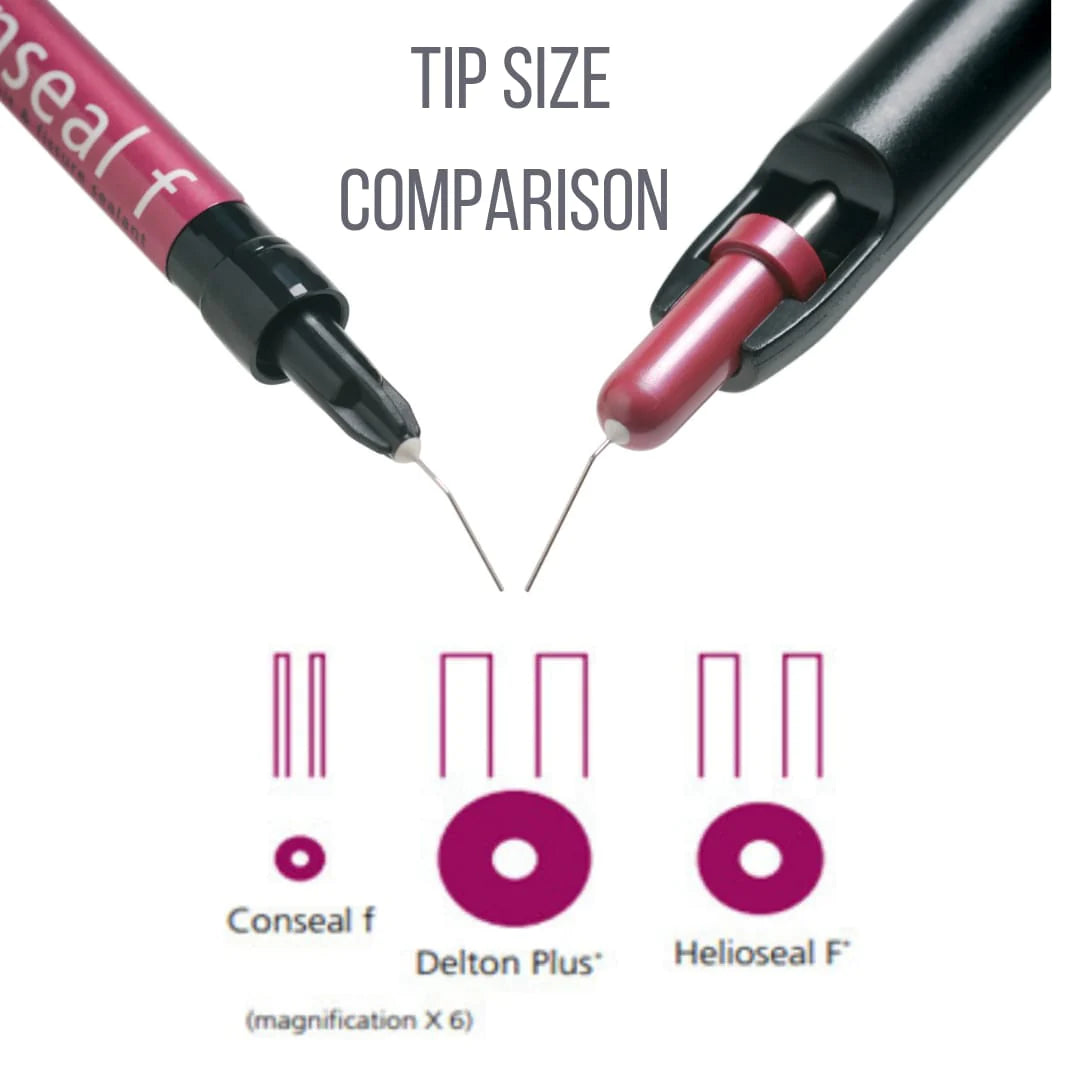 Conseal F offers better reach to difficult areas because of its pre-bent tips with a tip diameter is only 0.41mm as compared with other tips of 1.3-1.5mm.