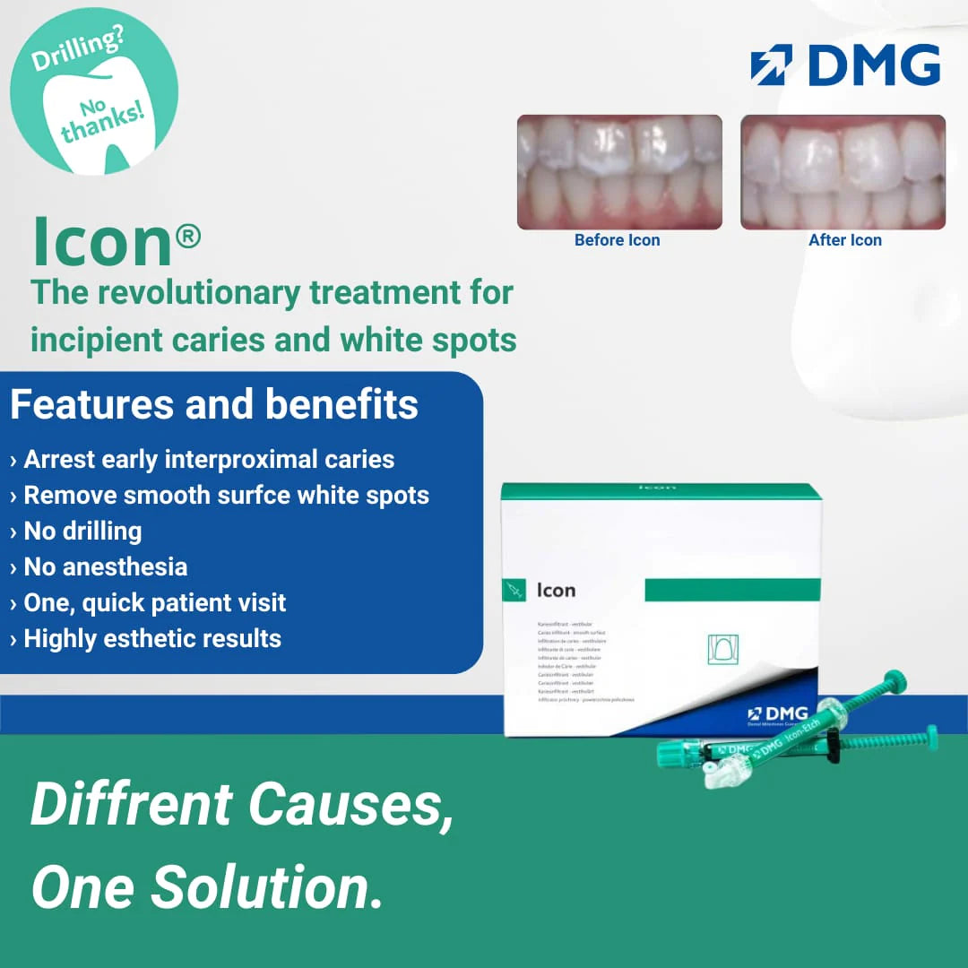 Caries infiltration with Icon fills the gap between prophylaxis and filling. It also optically blends in the lesion with the healthy enamel, allowing the innovative method to be used for esthetic treatments of front teeth, where appearance plays an important role.