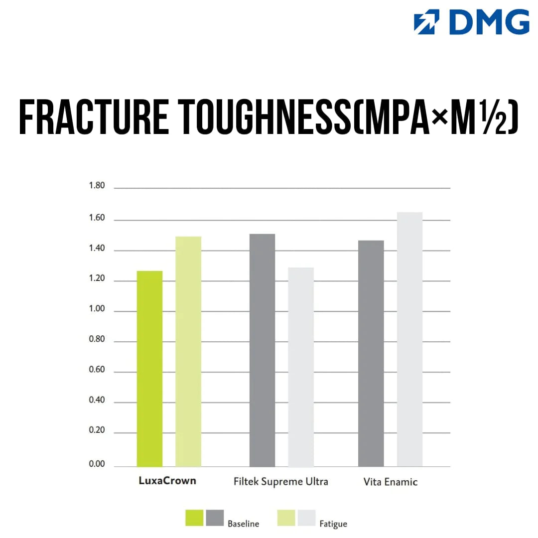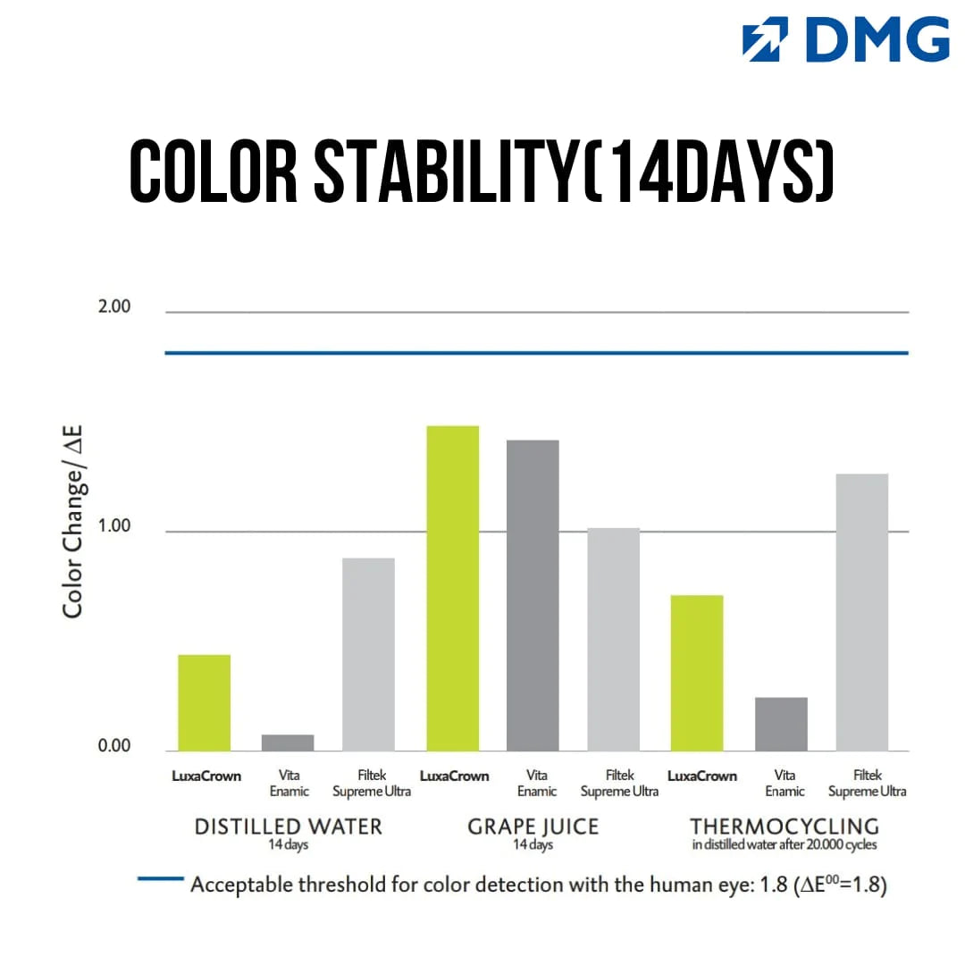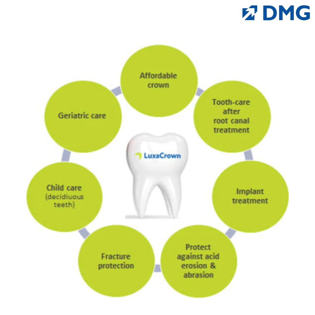 Thanks to its outstanding stability, LuxaCrown is raising the bar for restorations. Produced with ease in one chairside session, it offers impressive long-term reliability<upto 5 years>. In its role as a high-performance crown and bridge material, LuxaCrown bridges the gap between simple temporary provisionals and permanent dental prostheses with its remarkable combination of strength, durability and esthetics.