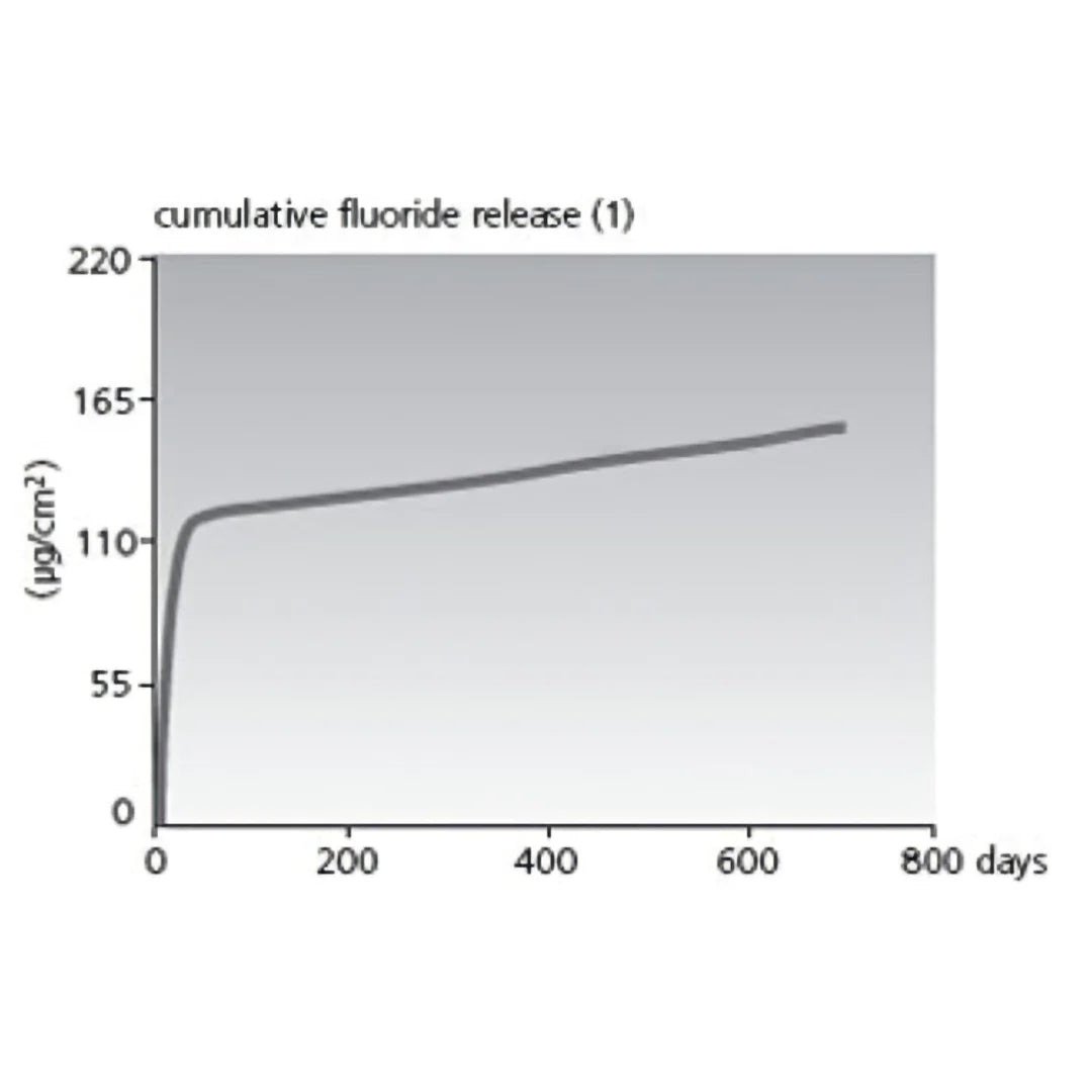 Riva Silver’s free movement of fluoride provides benefits to surrounding and adjacent tooth surfaces. Fluoride is held within the glass matrix without being bound by the structure. If the level outside the matrix is lower, then fluoride ions are released.