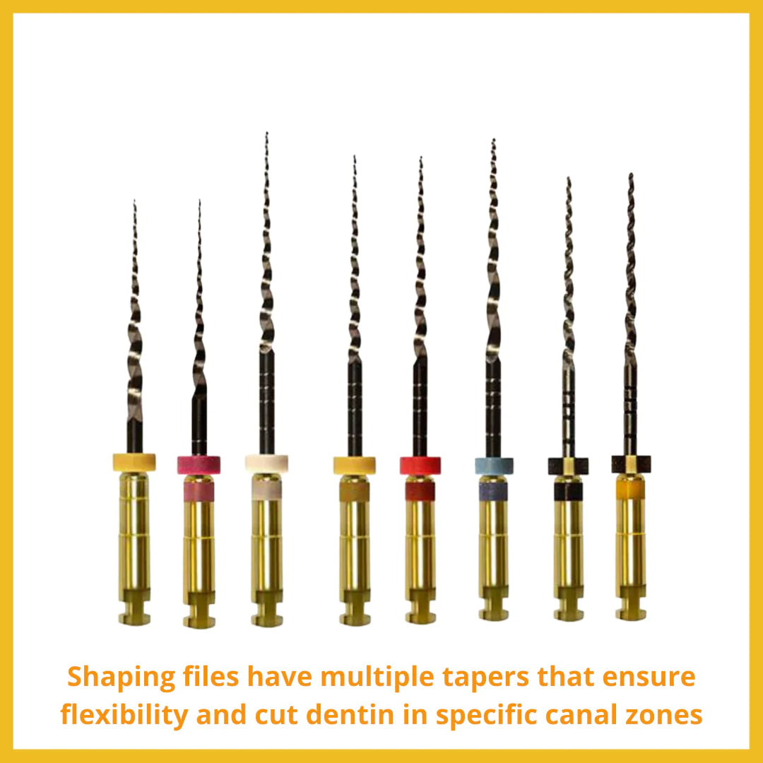 The finishing files ensure the proper apical fit for matching existing gutta percha points. Shaping files also have multiple tapers that ensure flexibility and cut dentin in specific canal zones.