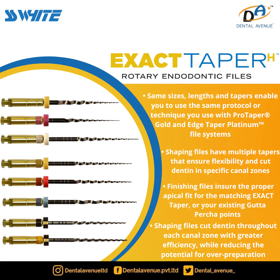 ExactTaperH files reduce the number of files needed in a case with familiar colours and file shapes to streamline the existing treatment process. Use the same protocol or technique you use with ProTaper® Gold or Edge Taper Platinum file systems with the same sizes, lengths and tapers.shaping files reduce the potential for over-preparation and enable:-
