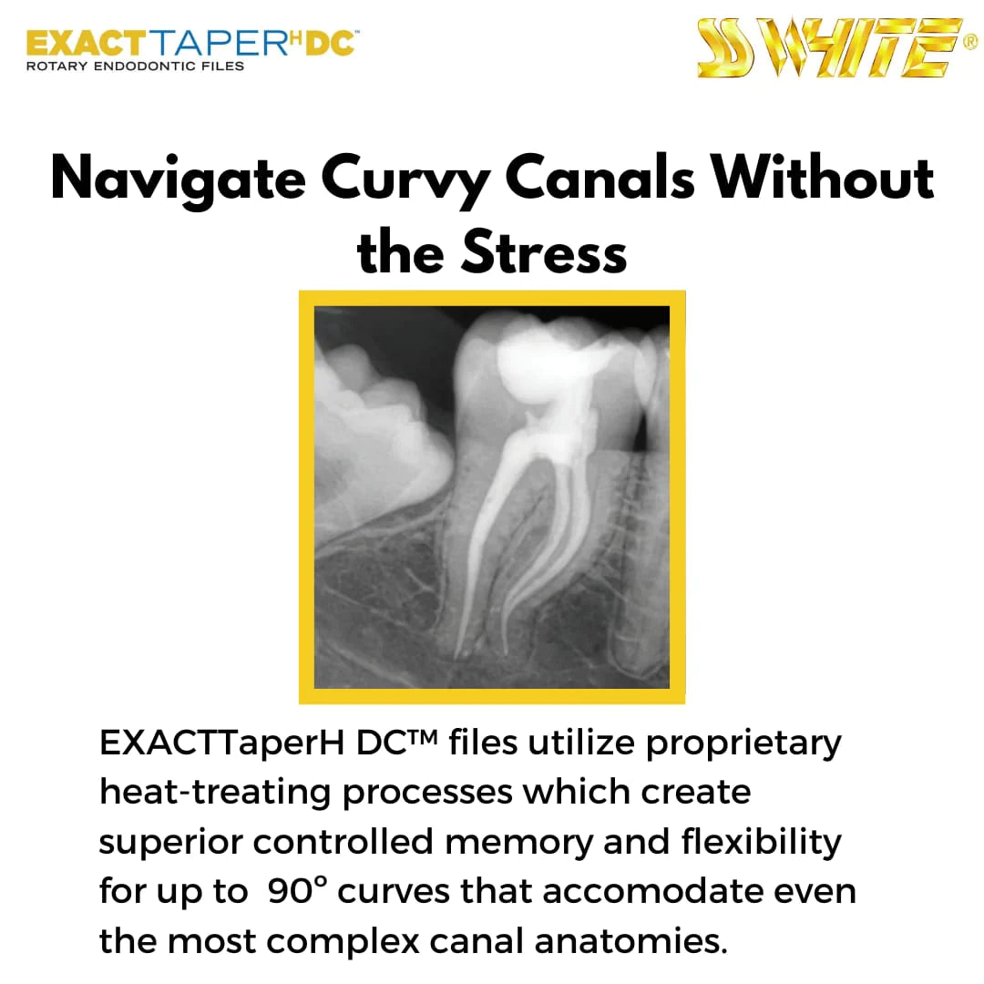 A. EXACTTaperH DC™ files utilise a proprietary heat-treating process that creates superior controlled memory and flexibility for up to 900 curves that accommodate even the most complex canal anatomies.
