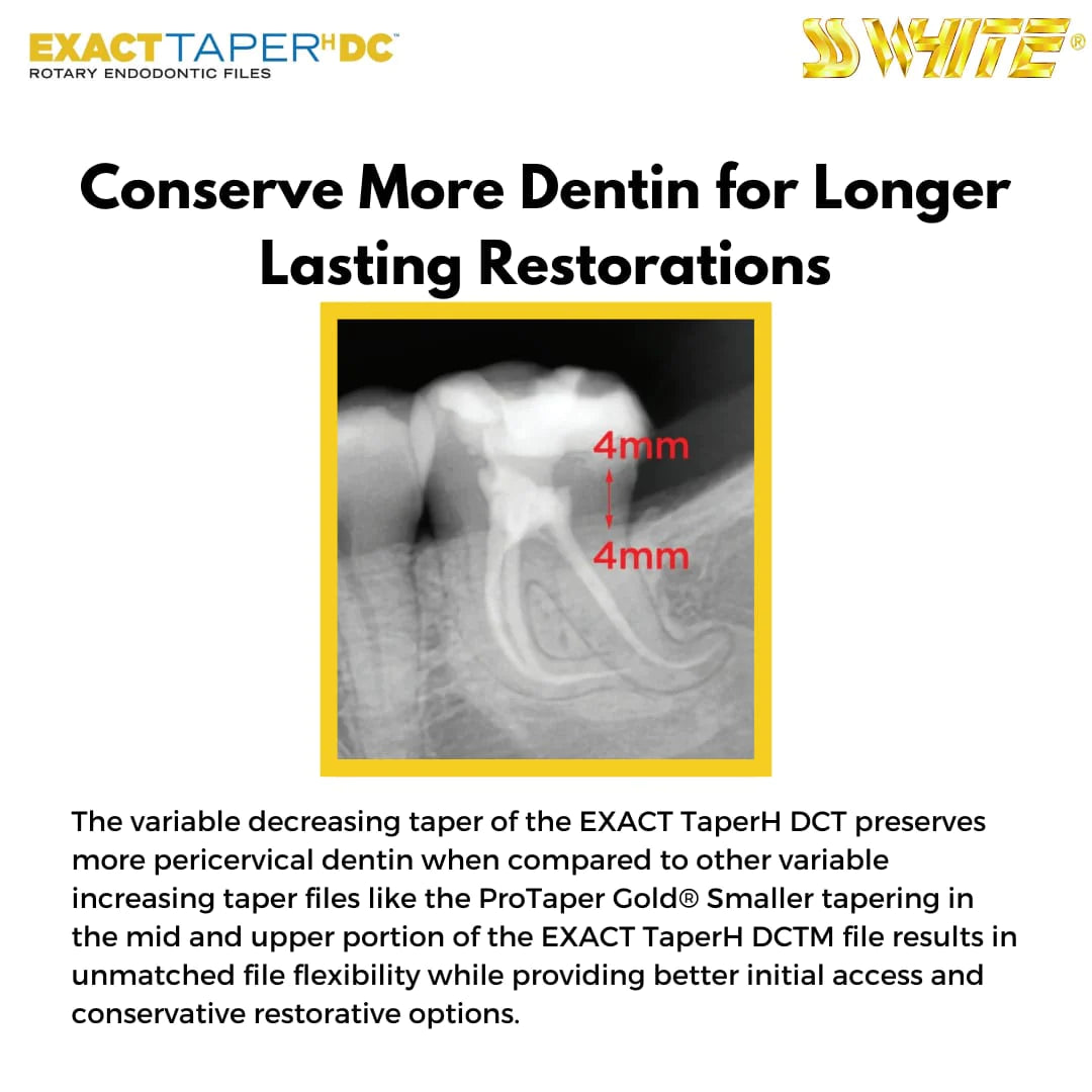 The variable decreasing taper of the EXACTTaperH DC™ preserves more pericervical dentin when compared to other variable increasing taper files like the ProTaper Gold®. Smaller tapering in the mid and upper portion of the EXACTTaperH DC™ file results in unmatched file flexibility while providing better initial access and conservative restorative options