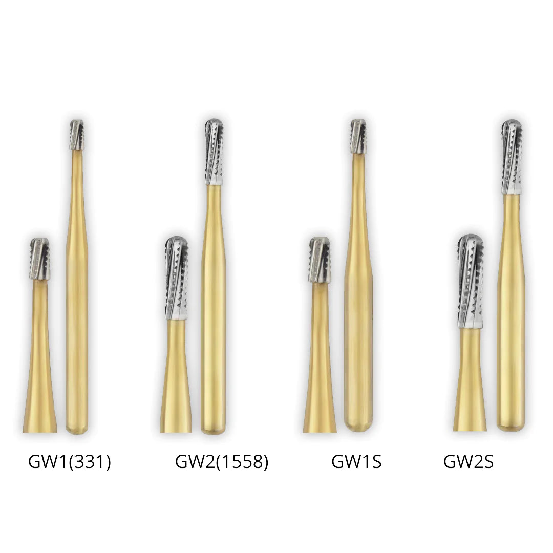 A. SSW gw carbide burs restoration removal carbide bur are better handling for removing metal-based restorations, they are also effective for trimming and finishing macro-filled and hybrid composites
