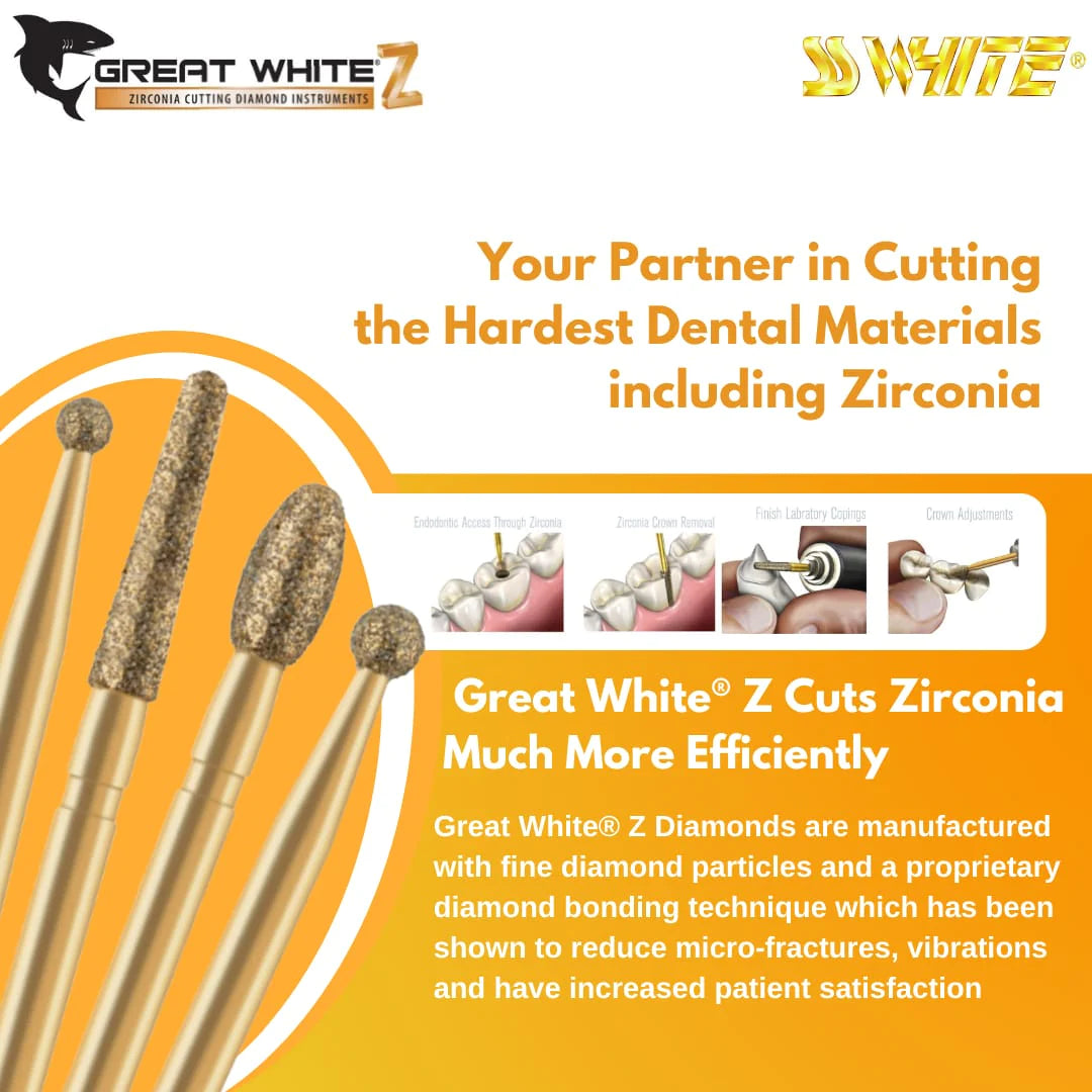 Great White Z Diamonds are a superior line of engineered diamond instruments designed to take on the toughest zirconia crowns and copings with ease