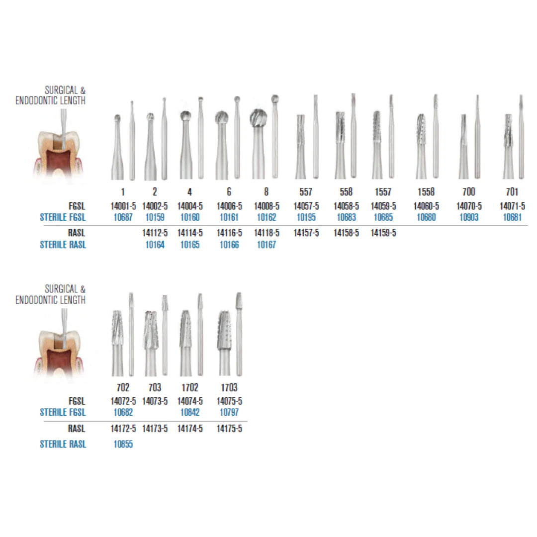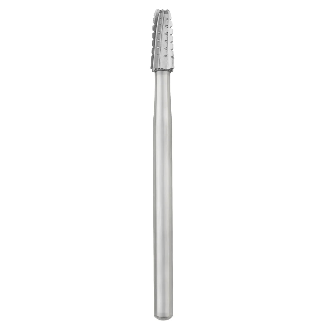 SS White® solid carbide burs are made with high quality fine-grain tungsten carbide, which produces a blade that is sharper and wears longer compared to less expensive coarse grain tungsten carbide. Blades made of fine grain tungsten carbide, retain shape even as they wear. Less expensive, large particle tungsten carbide dulls quickly as the large particles break from the blade or cutting edge