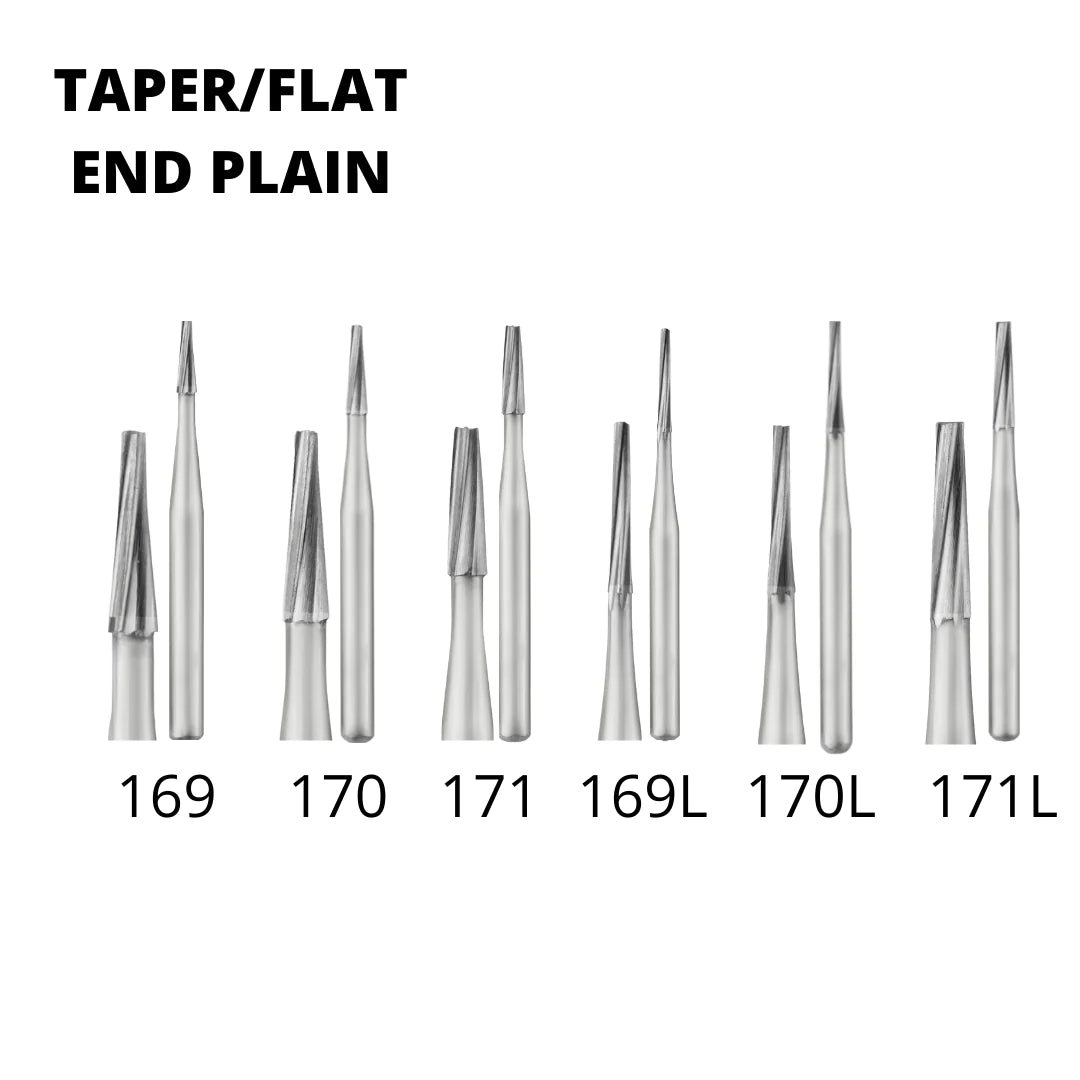 A. Flat-end taper burs are designed to make crown and bridge preparation more efficient and simpler. The Flat End Taper burs are specially designed to make the task of crown and bridge preparation simpler and more efficient