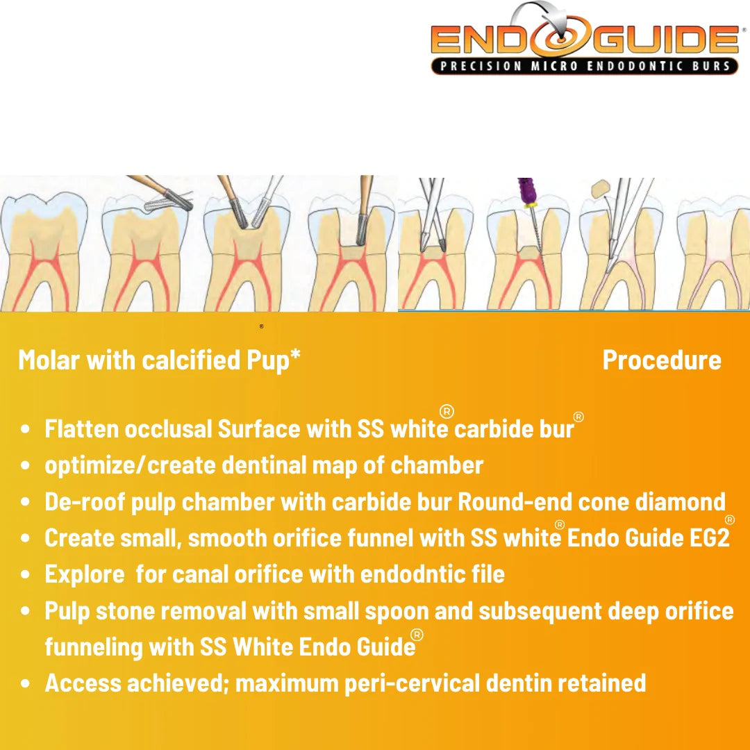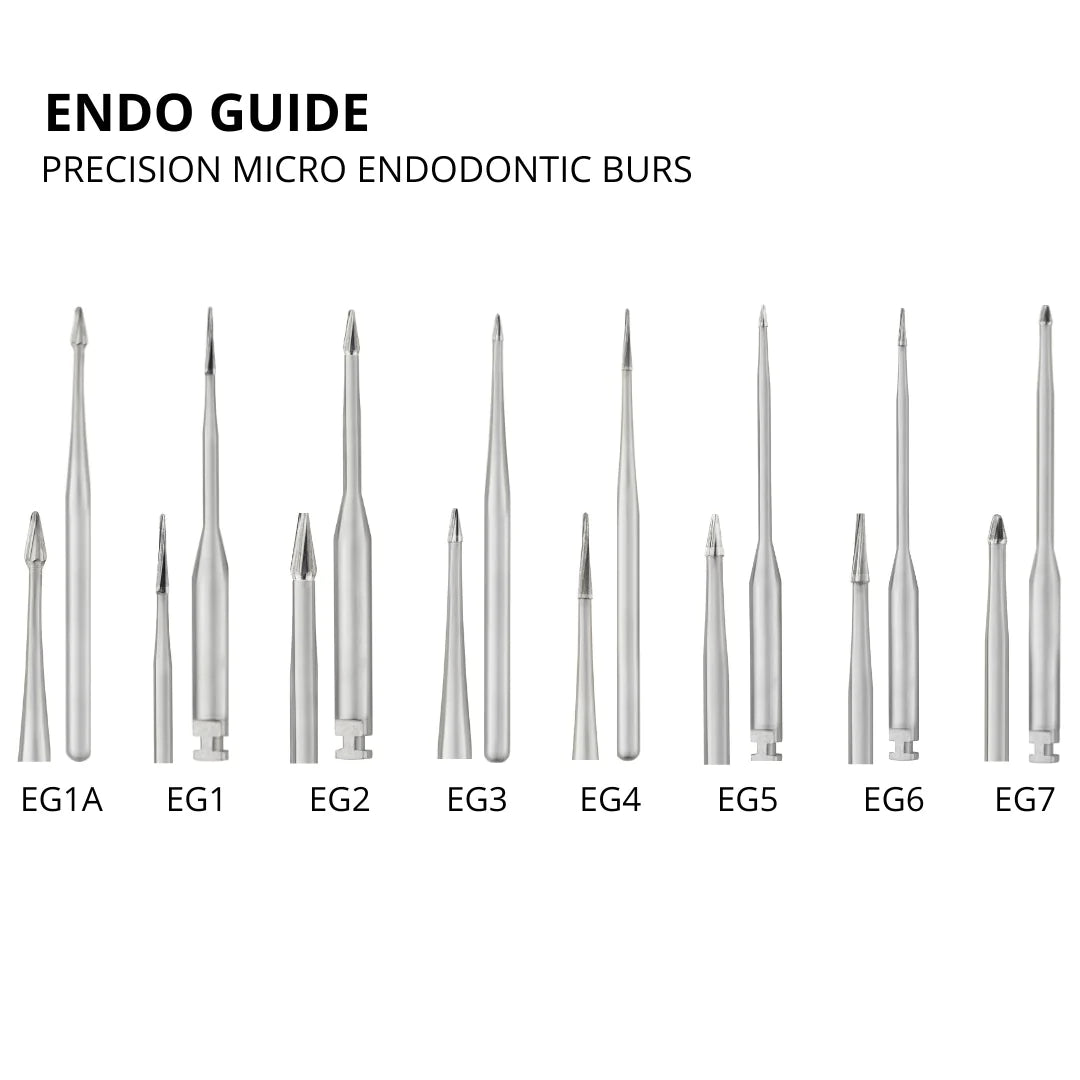 Efficient, straight-line access to canals is achievable with EndoGuide , a unique set of eight carbide burs for non-surgical root canal treatment. The patented, conical shaped micro-diameter tip acts as a self-centering guide for precision access to canals while conserving healthy peri-cervical dentin. The funnel-shaped bur design improves canal visualization